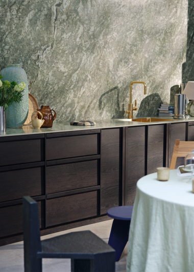 Glanshammar Classic Silk in porcelain stoneware is a perfect fusion of Swedish stone heritage and contemporary design. Inspired by the classic Ekeberg marble, Glanshammar captures the character of marble through its elegant Silk surface, a silky matte finish that creates a soft and sophisticated feel. The warm, classic tone reflects the natural beauty of Ekeberg marble and creates a welcoming and harmonious atmosphere. Here, the series is used as a kitchen countertop and as the surface of the kitchen island.