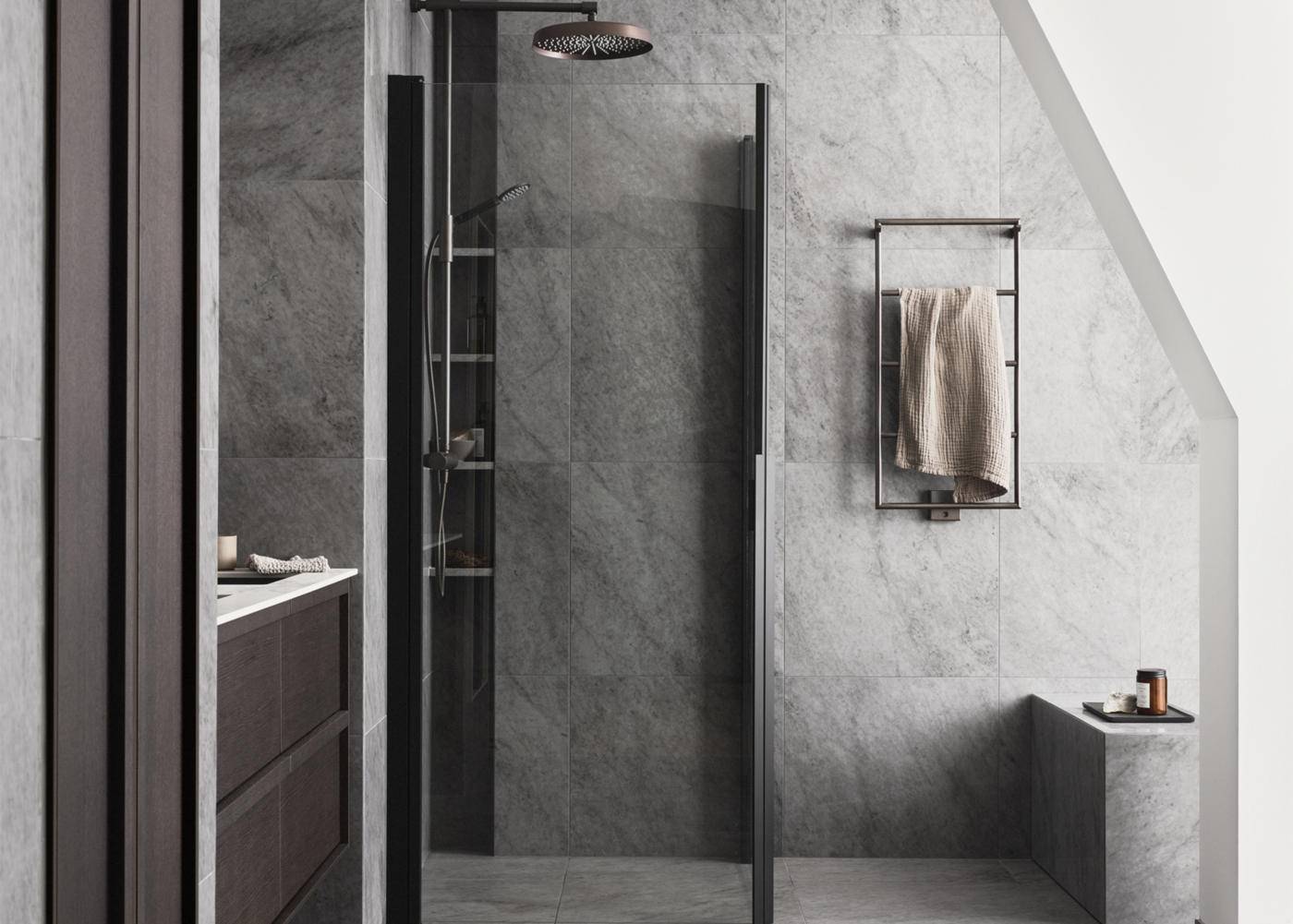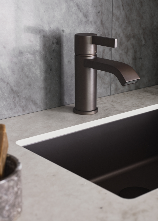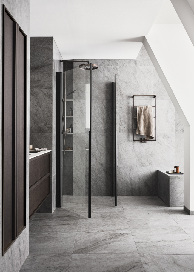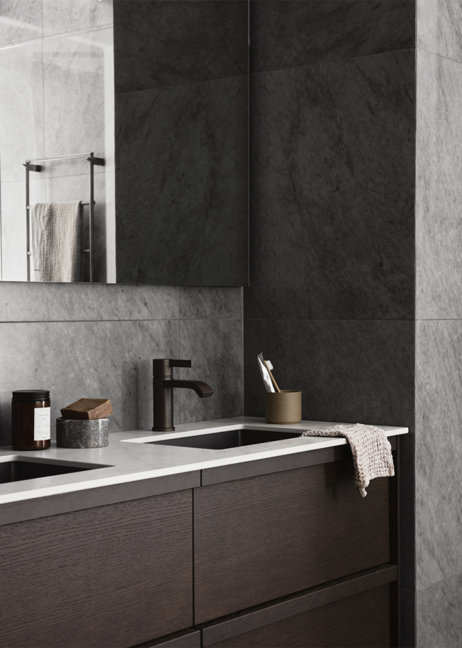 Glanshammar Dark i granitkeramik er et mørkere supplement til Glanshammar-serien – inspireret af den klassiske svenske Ekeberg-marmor. Denne nuance har en dybere, varm tone, der leder tankerne hen på de mørkeste partier i stenens naturlige farvespektrum. Glanshammar Dark giver en jordnær fornemmelse, hvor seriens elegance og oprindelse bevares.