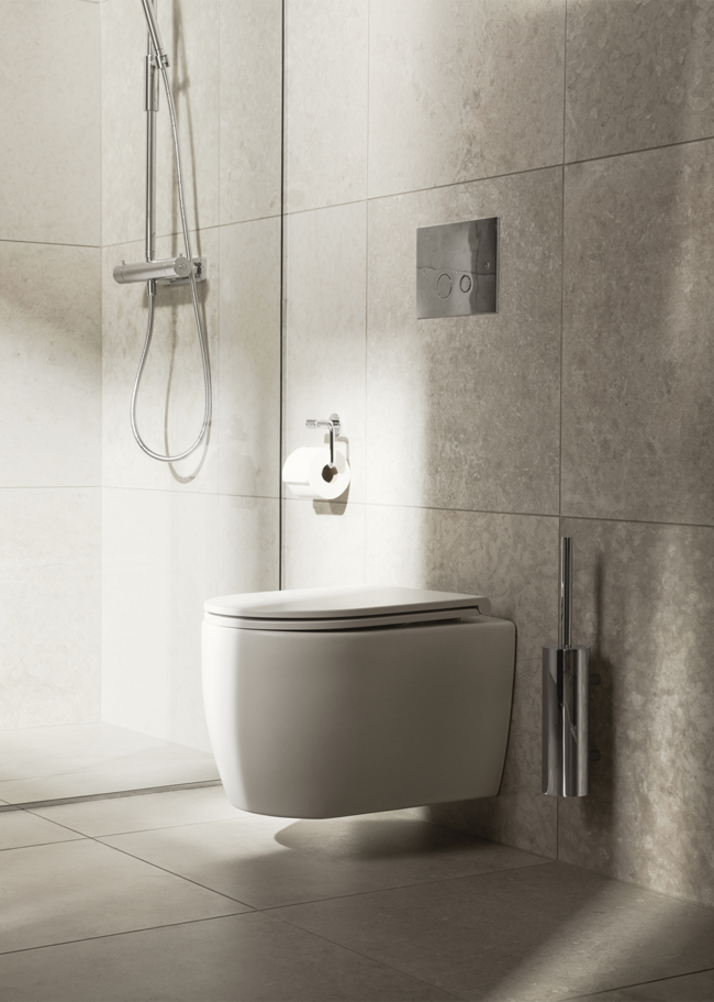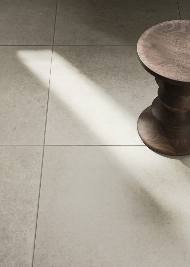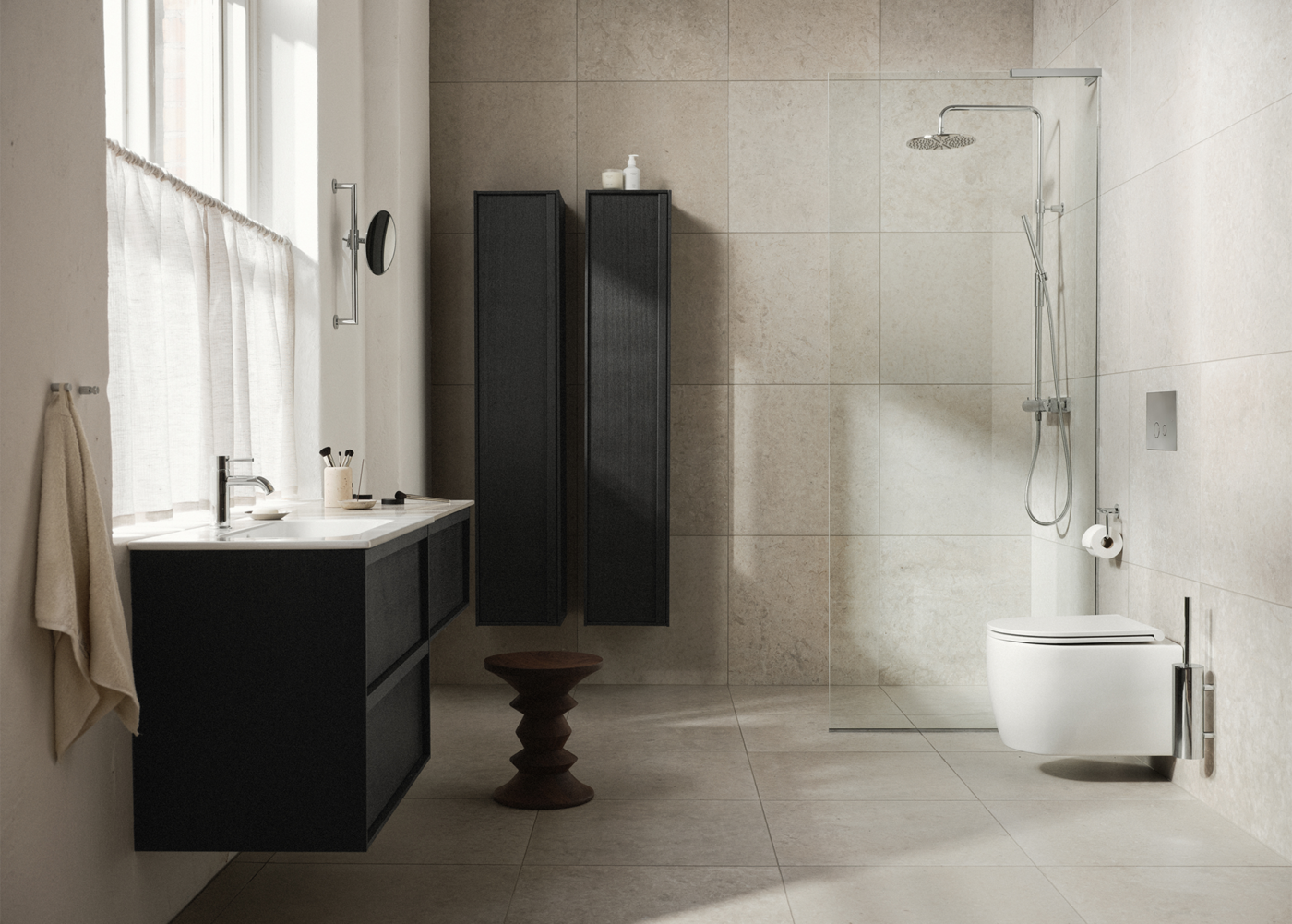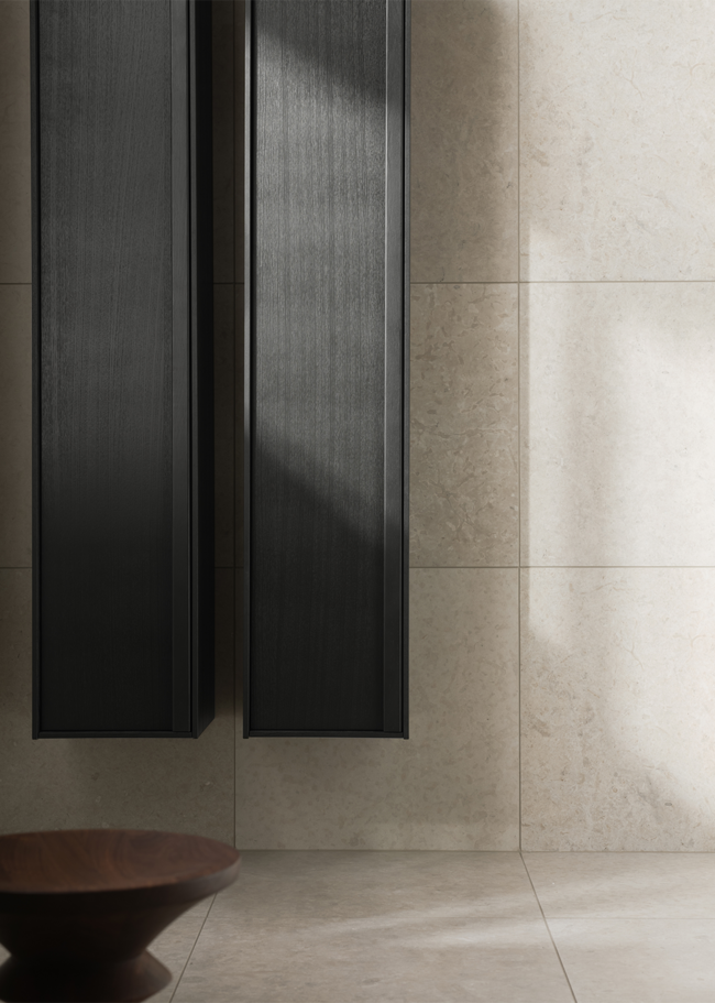 Et moderne badeværelse med en harmonisk og ensartet materialepalet. Runö Sand i stort format, 60x60, skaber et roligt udtryk med bløde, naturlige toner og diskrete variationer i overfladen. Fliserne bidrager til en sammenhængende følelse på både gulv og vægge.