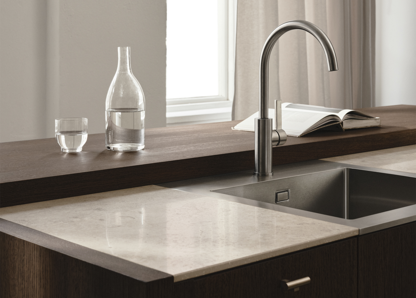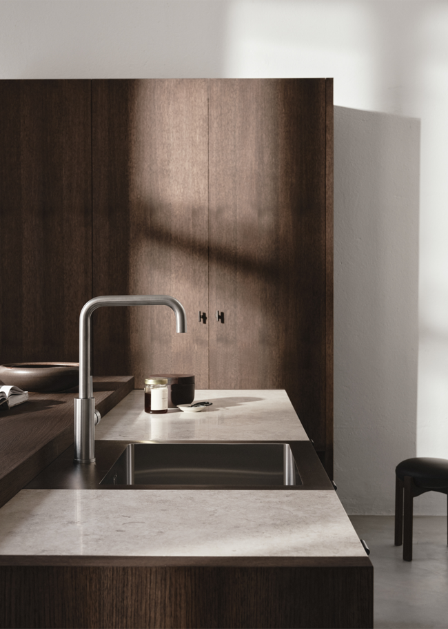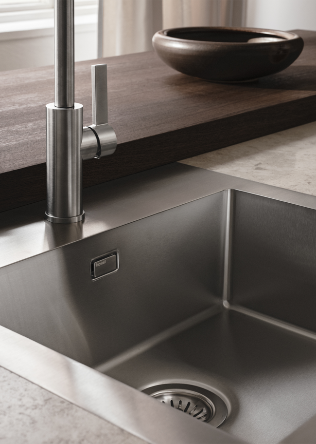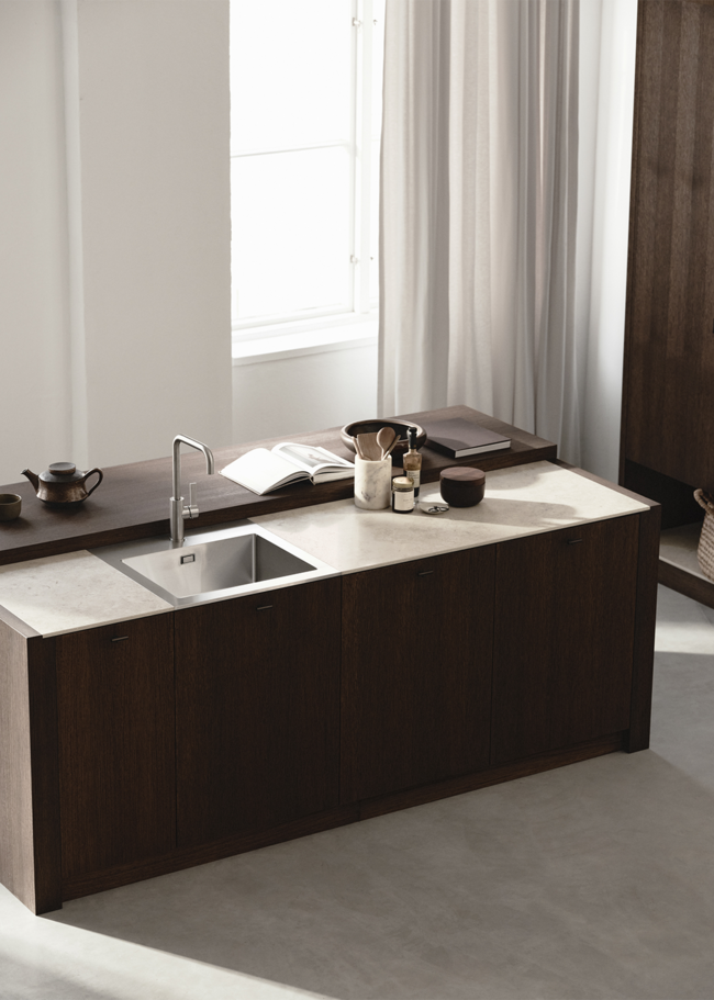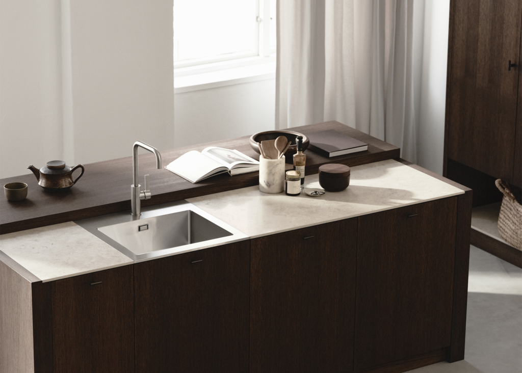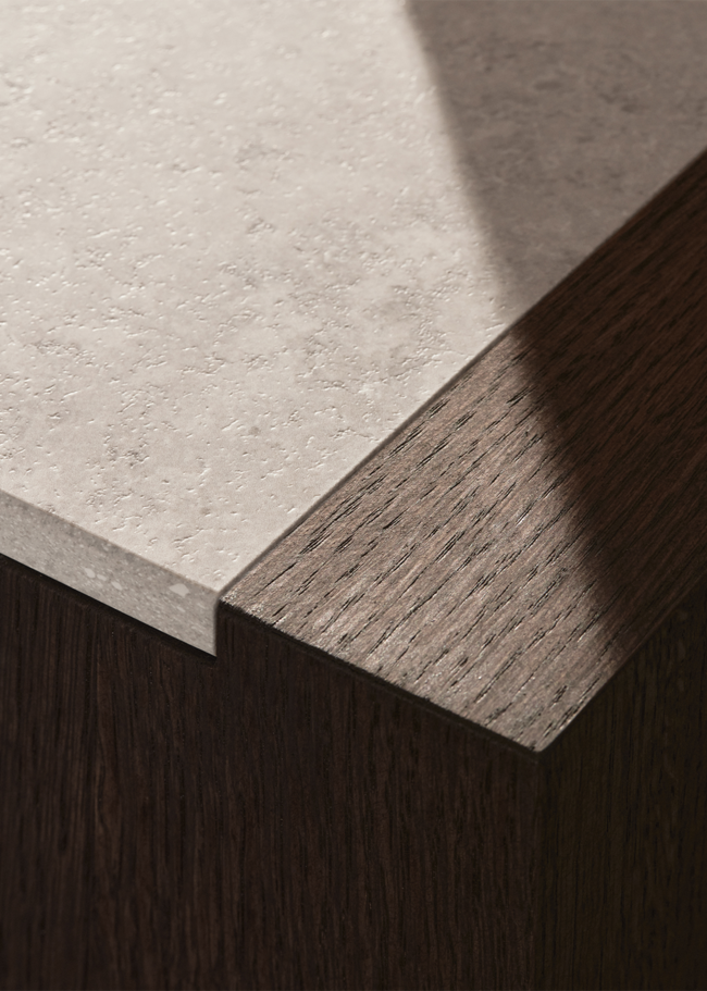 Velkommen til dette lyse og luftige køkken, hvor hver detalje har sin plads. Bordpladen i Jura Select Ivory Honed-serien, sammen med træet og vasken, skaber et sømløst udtryk. Bordpladen forener klassisk æstetik med moderne teknologi for at skabe en overflade, der både er funktionel og smuk. Inspireret af den populære jurakalksten, kendt for sine fossillignende detaljer, hulrum og subtile årer, har Jura Select Ivory Honed fanget stenens tidløse skønhed og tilpasset den til nutidens behov.