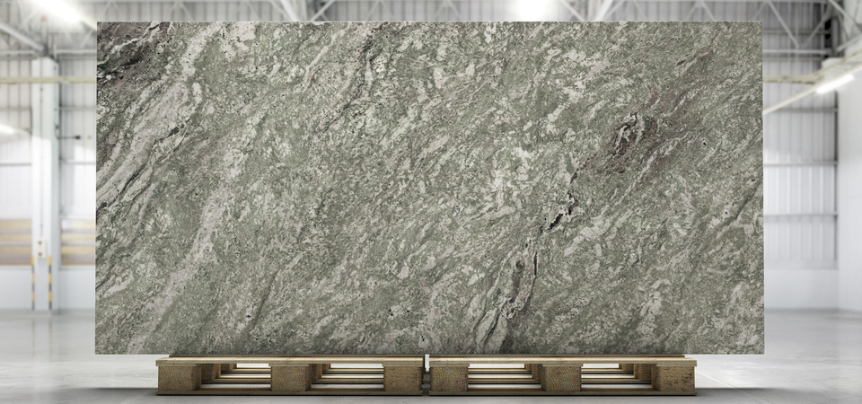 Seriens mønster bevæger sig mellem mørke grøn-sorte partier og blødere nuancer i lysegrønt og gråt, hvilket giver overfladen en levende karakter med naturlig dybde. Den silkematte Honed-overflade er slebet for at fremhæve materialets struktur og skabe et blødt, elegant udtryk med en behagelig taktil fornemmelse.
